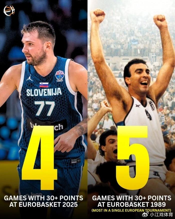 与此同时,东契奇本届赛事场均可以拿到34分,他六场比赛分别拿到了34分、39分、26分、26分、37分还有42分,已经拿到了4次30+。而欧洲杯历史单届赛事记录为希腊球星尼科斯-盖利斯的单届5次30+,东契奇有很大的概率追平、甚至有可能打破这项记录。